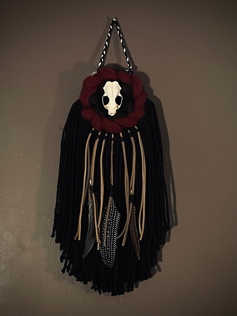 Woven wall hanging featuring an ethically sourced mink skull, feathers, leather, wool roving and yarn fringe. Handcrafted in ritual with the intention of strengthening one's personal path.